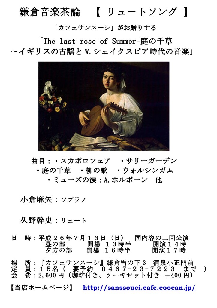 鎌倉音楽茶論 【 リュ-トソング 】 「The last rose of Summer-庭の千草 〜イギリスの古謡とW.シェイクスピア時代の音楽」