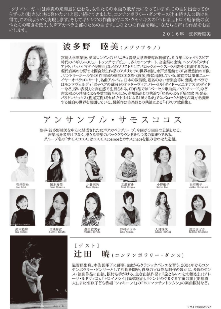 出演 波多野 睦美 (メゾソプラノ) アンサンブル・サモスココス ゲスト 辻田 暁 (ダンス)